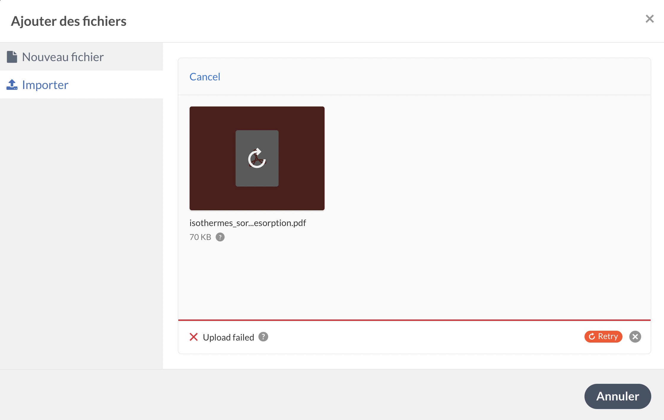 Lorsque j’essaie d’uploader des fichiers (images, graphiques en pdf ou png), je reçois une notification “upload failed” et mon fichier n’est pas ajouté au projet.